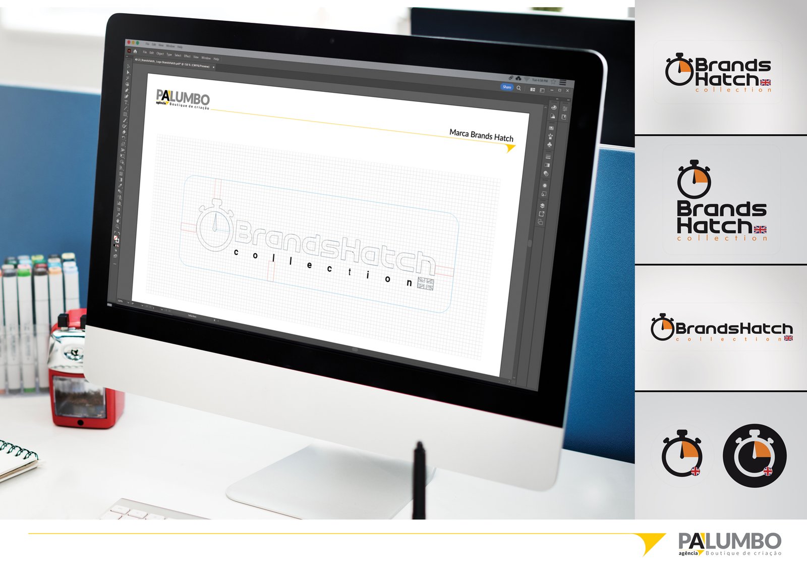 O logotipo da “Brands Hatch Collection”, criado pela Agência Palumbo, encapsula perfeitamente a essência de velocidade e tradição. Com um design inspirado no icônico autódromo de Brands Hatch na Inglaterra, o logotipo faz uso inteligente de um cronômetro para simbolizar não apenas a velocidade, mas também a precisão e o legado dos grandes carros de corrida. A escolha do cronômetro como elemento central não é apenas uma homenagem à história do automobilismo, mas também ressalta a ideia de excelência e de capturar momentos perfeitos no tempo.
