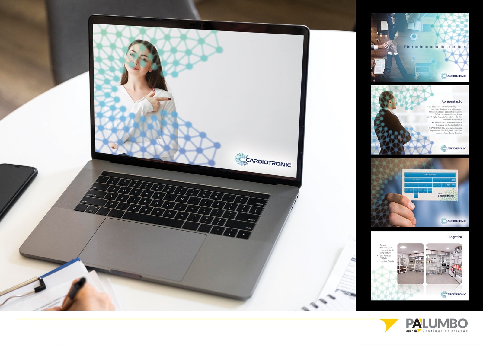 A Palumbo desenvolveu para a Cardiotronic uma apresentação em PowerPoint com identidade visual forte, moderna e totalmente alinhada ao branding da empresa. Mais do que uma simples peça de apoio comercial, o material tornou-se uma ferramenta estratégica de prospecção, usada com destaque pelo time de vendas para apresentar a empresa e seu portfólio de forma clara, envolvente e profissional.