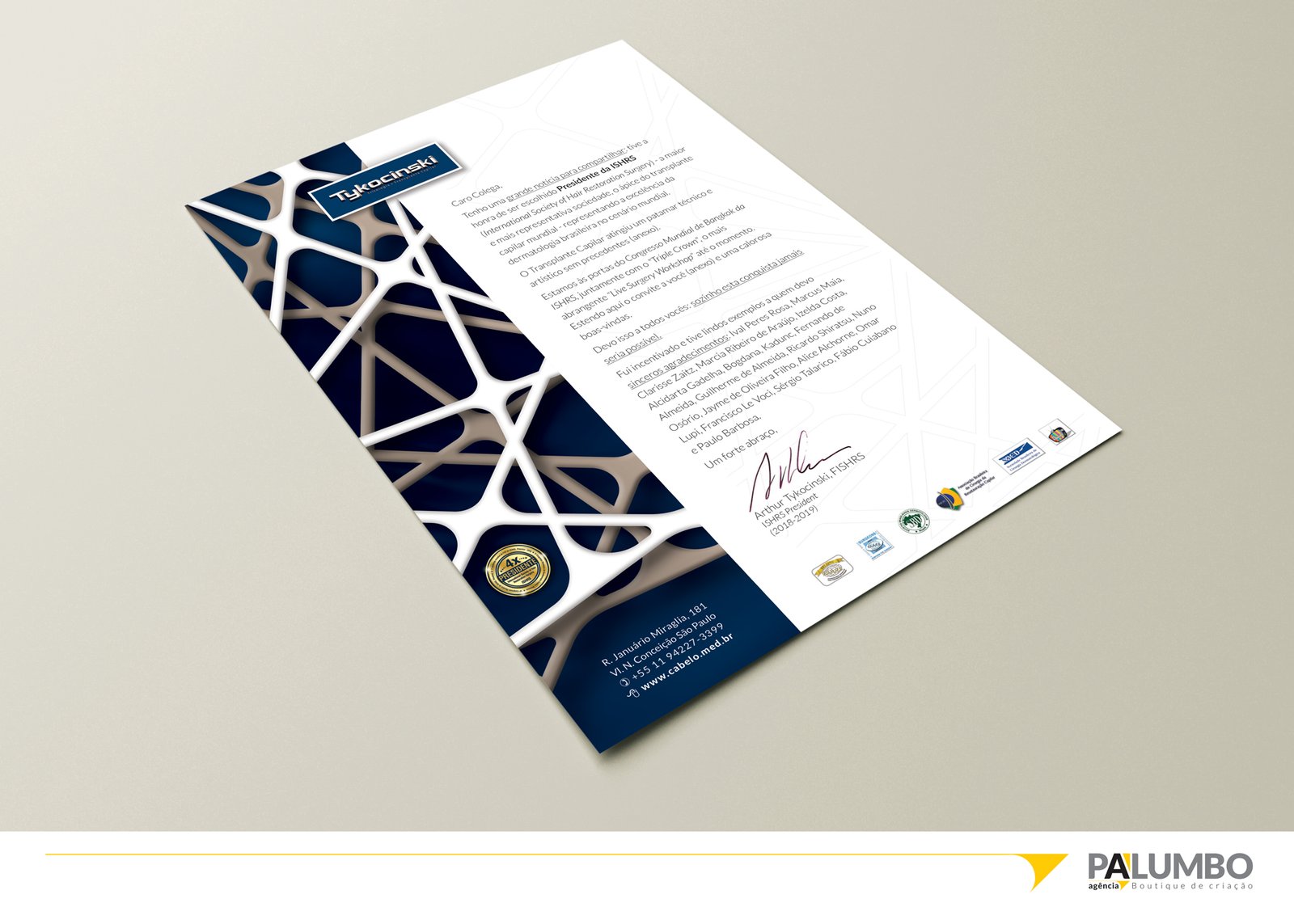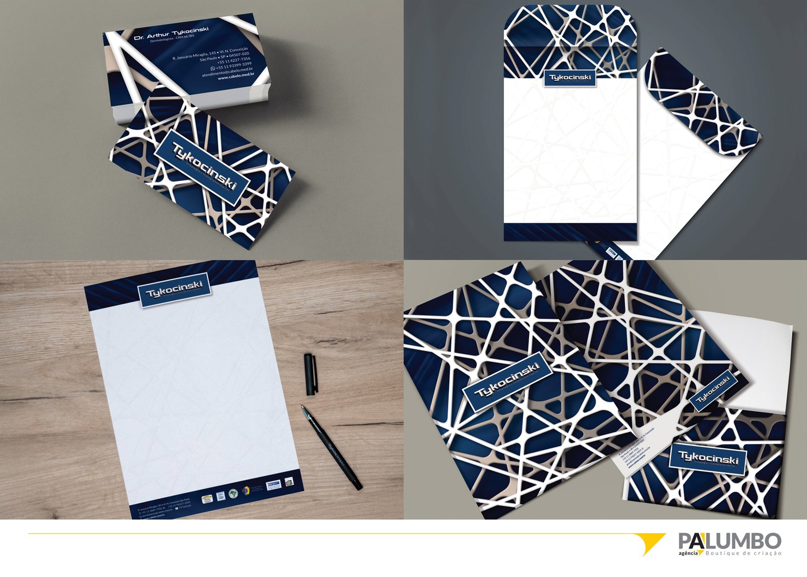 A identidade visual da Clínica Tykocinski vai muito além da marca. Pensando na comunicação integrada da clínica com seus pacientes e parceiros, a Agência Palumbo desenvolveu um conjunto completo de papelaria institucional com alto padrão estético e funcional.
