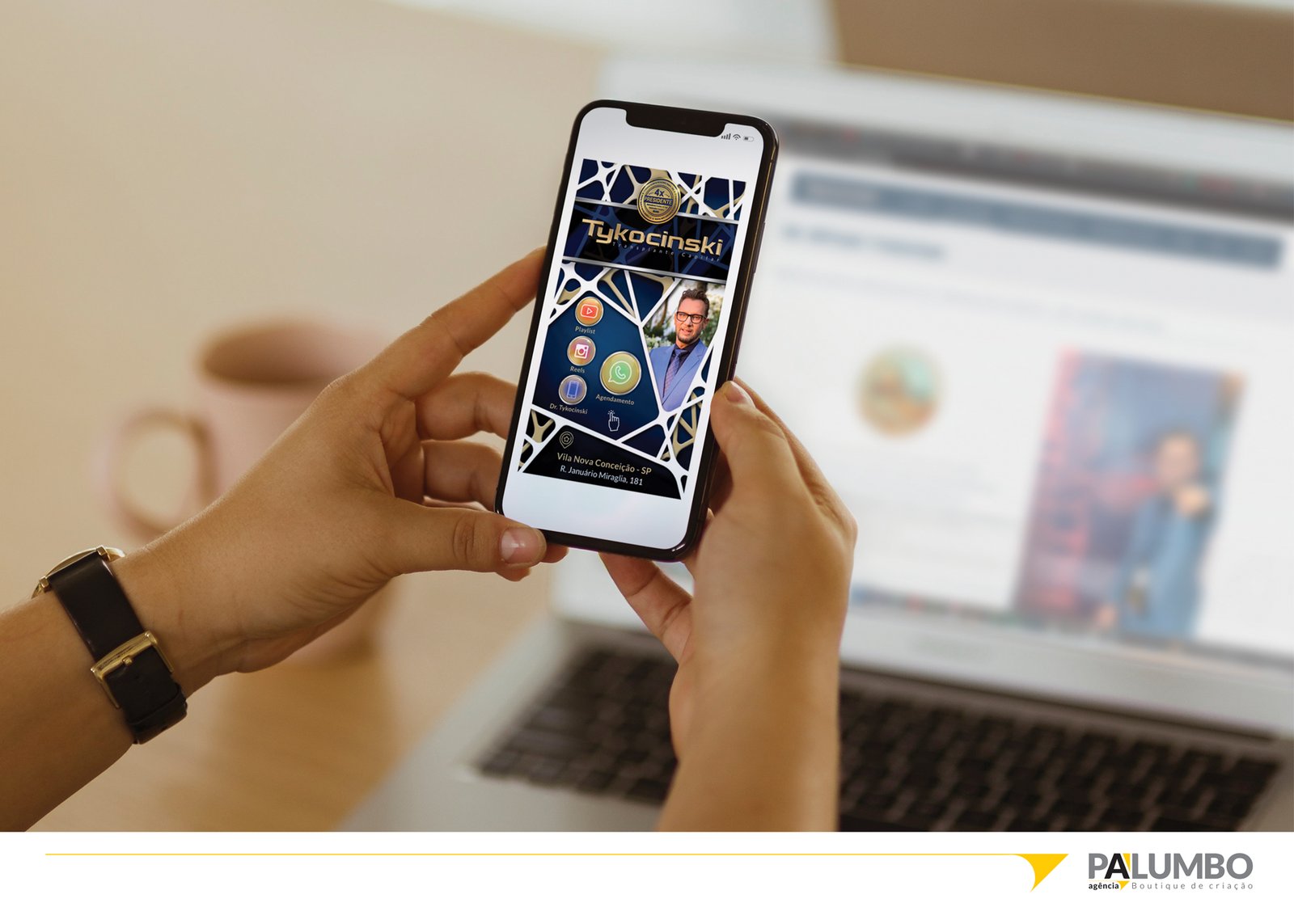Aliando tecnologia à comunicação eficiente, a Agência Palumbo desenvolveu para a Clínica Tykocinski um cartão de visita 100% digital e interativo. Com visual impactante e identidade alinhada à papelaria institucional, a peça permite, com apenas um clique, acesso direto a funcionalidades essenciais como localização, telefones, WhatsApp, vídeos, currículo profissional e até marcação de consultas.