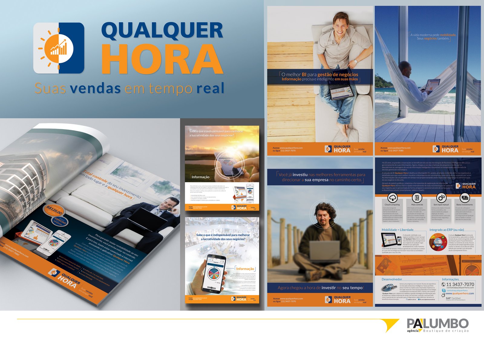 Desenvolvemos a marca e a identidade visual do “Qualquer Hora”, que foram aplicadas em uma ampla variedade de materiais, incluindo anúncios para revistas tanto online quanto offline, landing pages, atualizações de site, apresentações, folhetos e uma presença consistente e engajadora nas redes sociais. Todos esses elementos foram cuidadosamente projetados para refletir a inovação e o valor que o “Qualquer Hora” traz para seus usuários, facilitando uma gestão empresarial mais eficaz e informada.