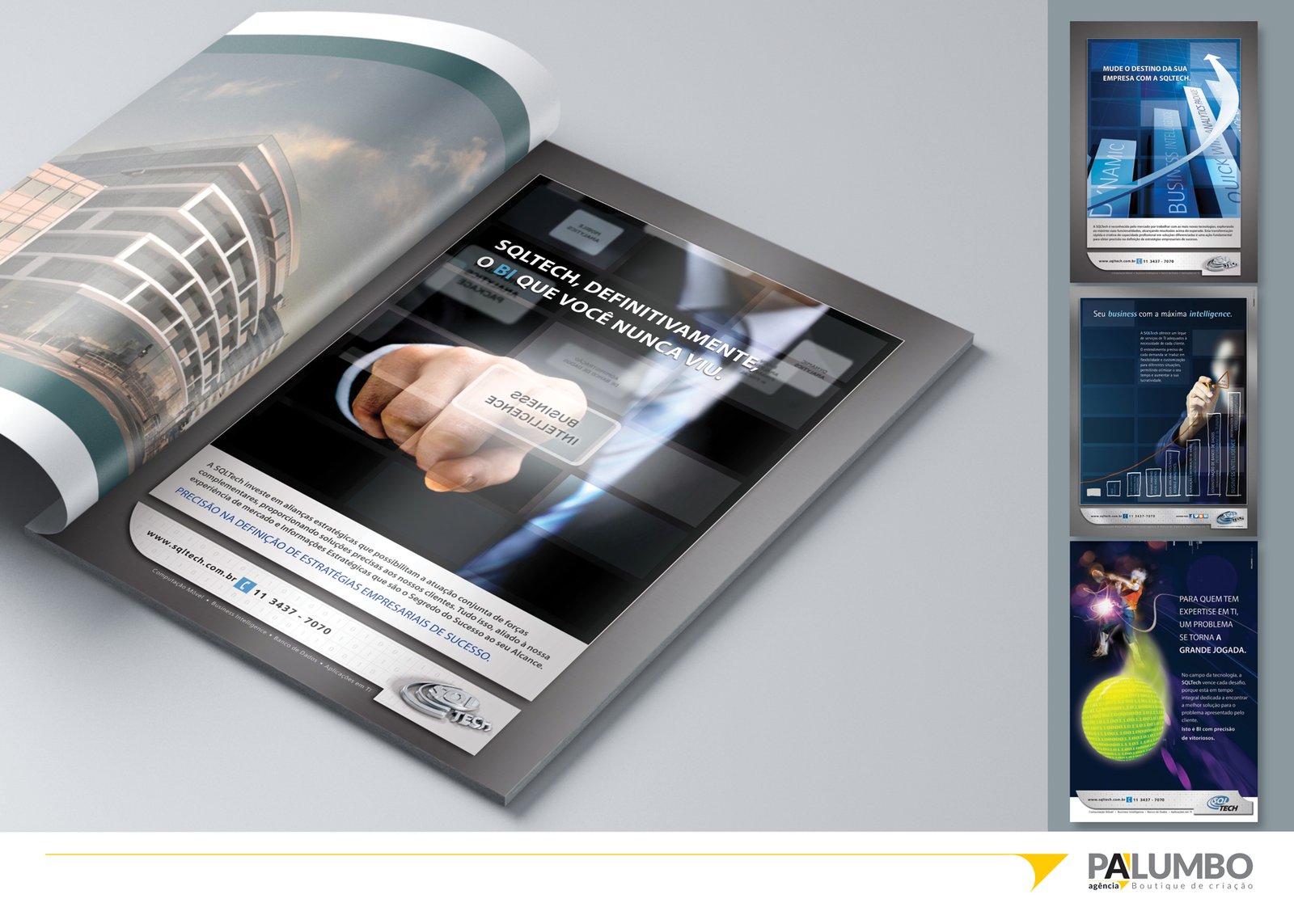 Ao criar anúncios que se destacam visualmente e entregam mensagens poderosas, garantimos que a SQLTech ressoe com seu público-alvo, seja através de revistas especializadas ou jornais de grande circulação. Esta abordagem não só reforça a identidade visual da SQLTech, como também evidencia o compromisso da Palumbo com excelência criativa e estratégica.