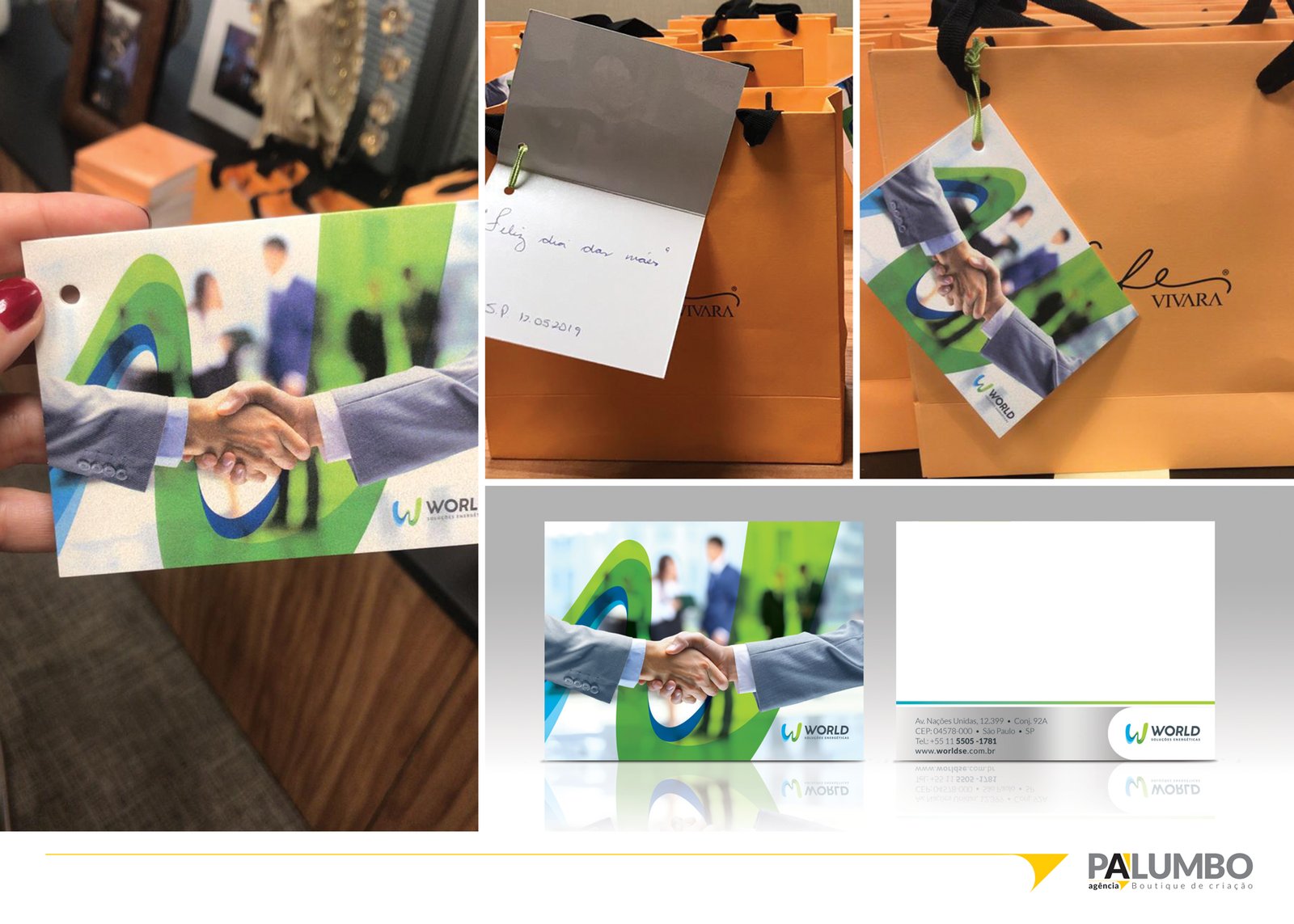 Para complementar seu trabalho com brindes e presentes corporativos, a Agência Palumbo não apenas escolhe os itens adequados, mas também cria uma embalagem e cartão personalizados para cada presente. Este nível de personalização, que inclui a assinatura do dono da empresa nos cartões, não apenas realça o valor do brinde, mas também fortalece a imagem da World SE, deixando uma impressão duradoura de profissionalismo e cuidado nos detalhes. Cada aspecto do brinde corporativo é pensado para maximizar o impacto positivo junto aos clientes e colaboradores, assegurando que a experiência da marca seja única e memorável.
