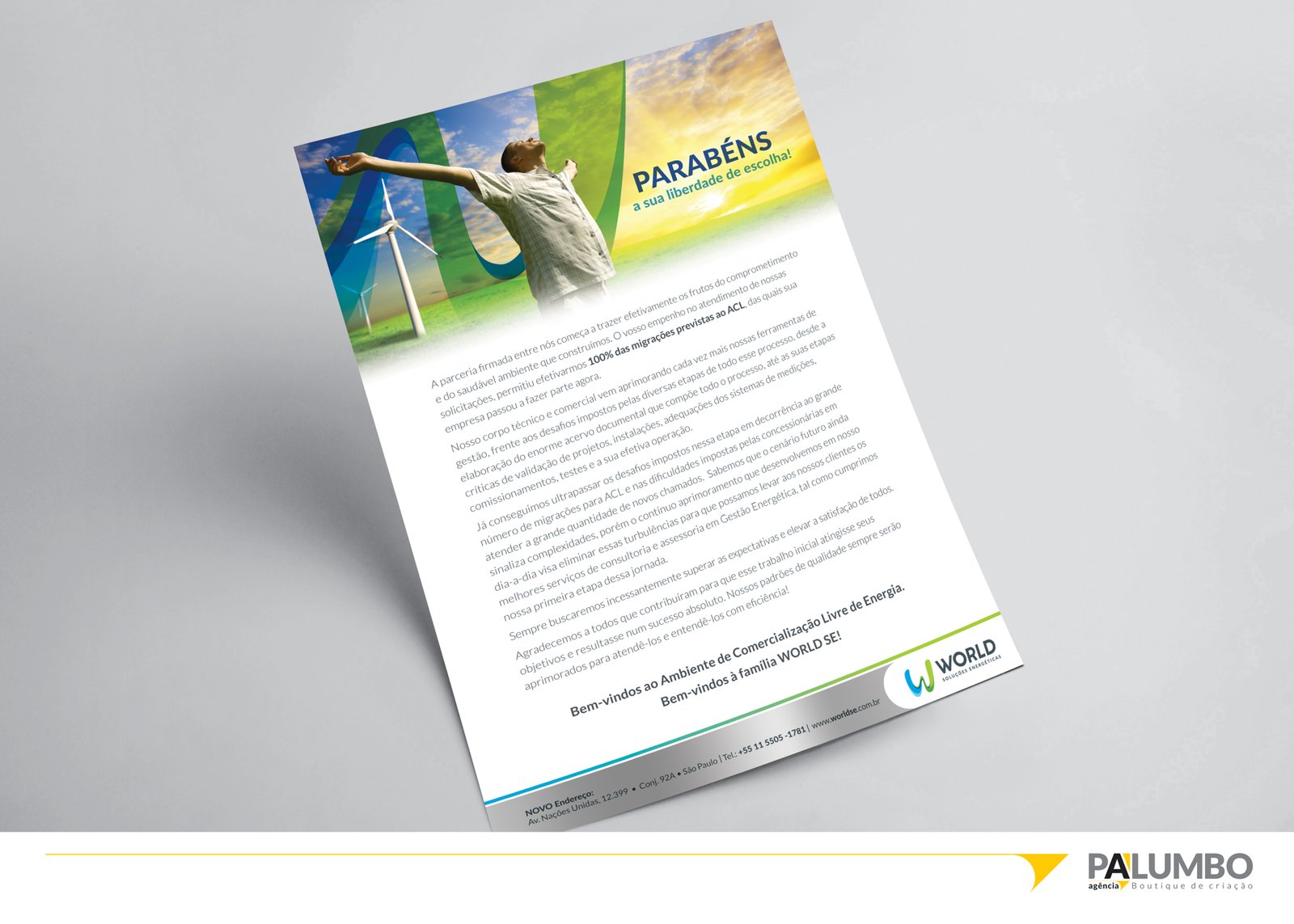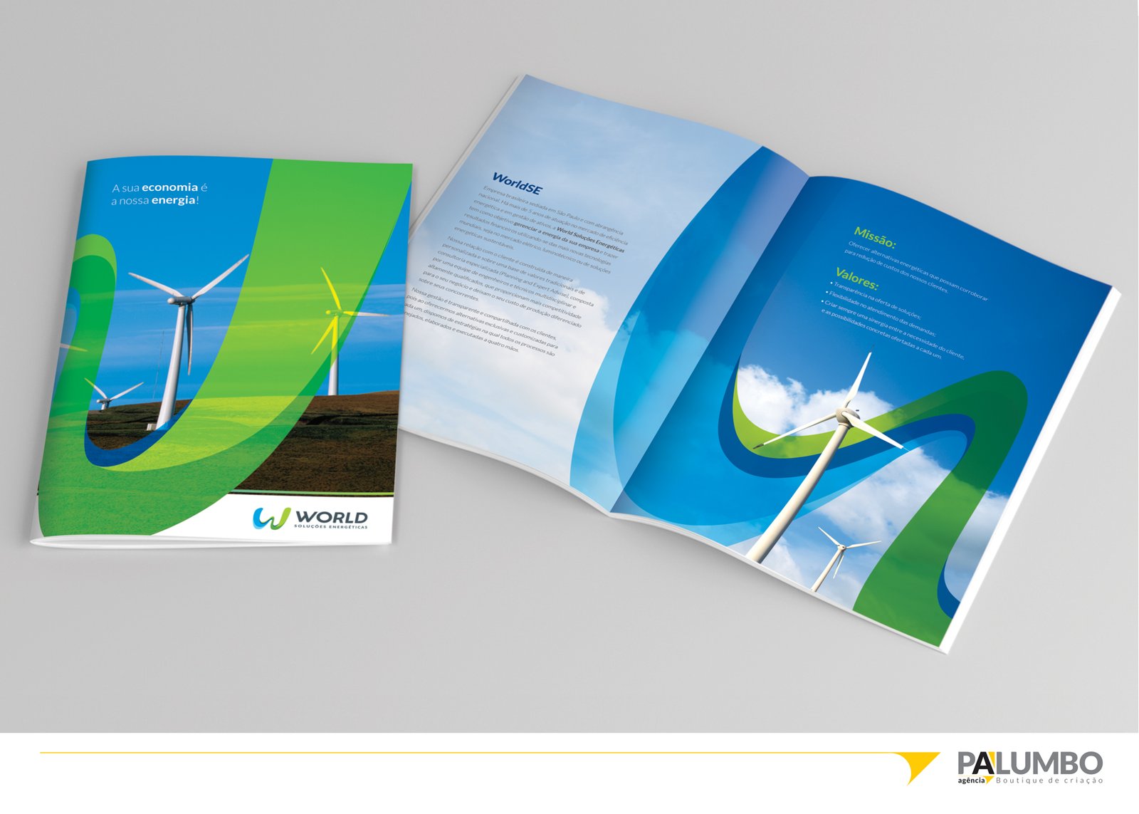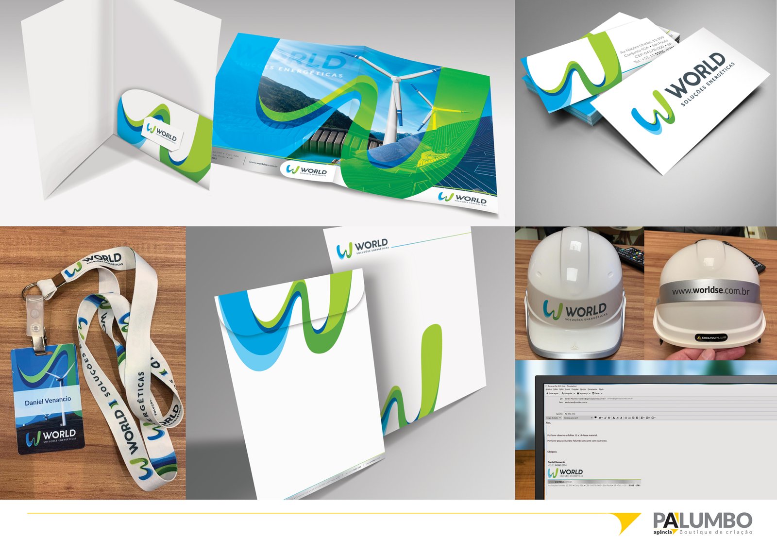 A identidade corporativa criada pela Agência Palumbo para a World SE reflete um espírito de inovação e dinamismo, coerente com os valores e o setor de atuação da empresa. Utilizando o elemento visual das “ondas” do logotipo, a agência desenvolveu uma linguagem visual colorida e moderna que permeia todos os materiais corporativos, desde a papelaria até os comunicados e o portfólio de produtos. Esta abordagem não apenas distingue a World SE dos seus concorrentes, mas também reforça sua mensagem de liberdade e renovação no mercado de energia, simbolizando a energia renovável e a escolha consciente do consumidor.
