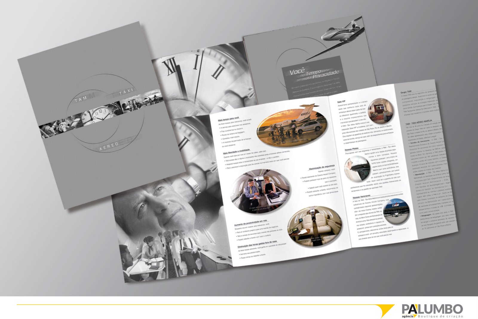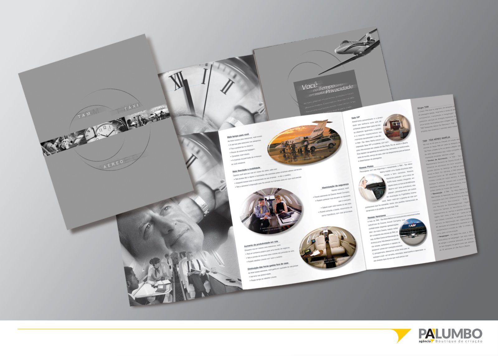 • Desenvolvimento de conceitos e mensagens para reforçar o posicionamento premium da TAM Jatos Executivos, como o folder com o mote: “Você no tempo certo, com muita privacidade.”