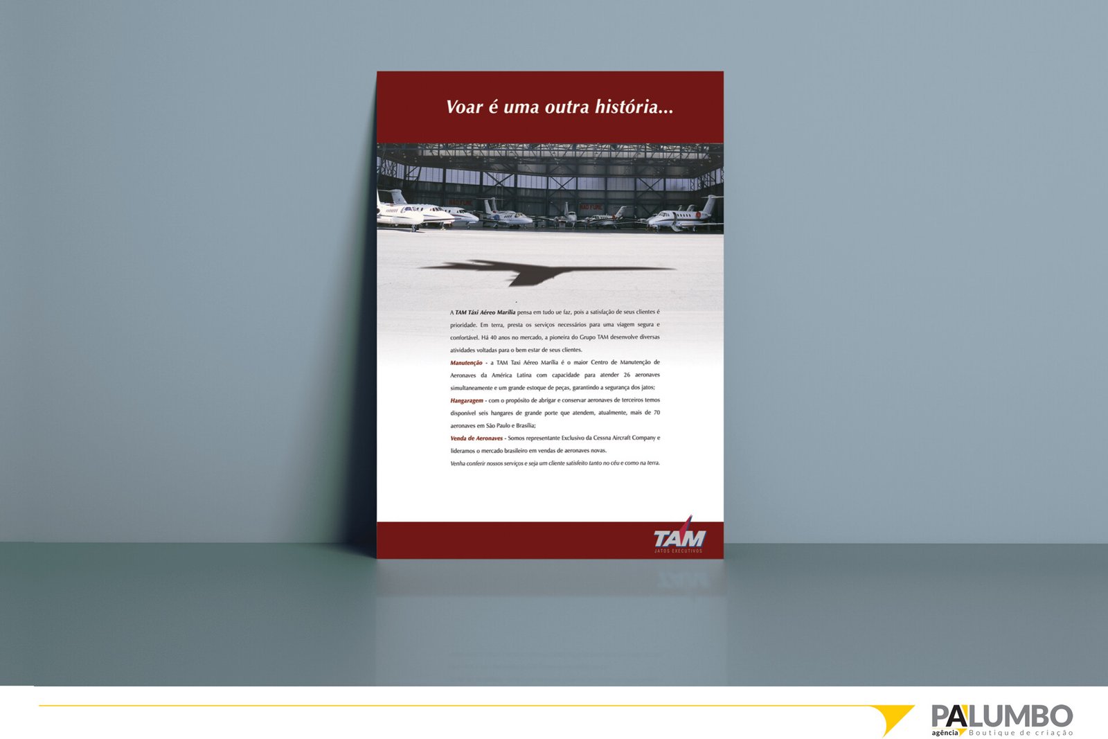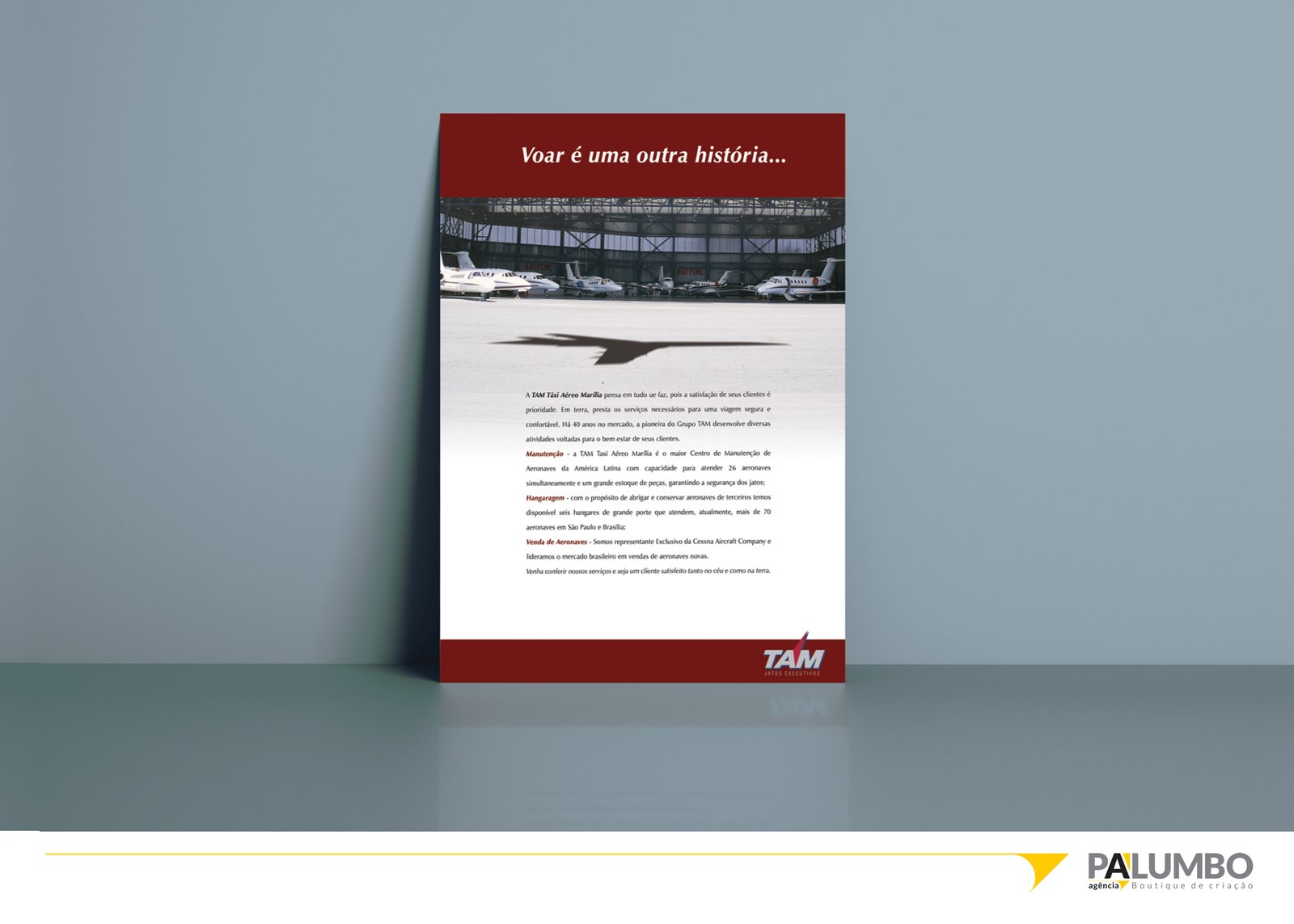 Paralelamente ao sucesso conquistado com a conta da TAM Linhas Aéreas, a Palumbo teve a honra de embarcar em mais um projeto desafiador e inspirador: a comunicação da TAM Jatos Executivos — empresa do Grupo TAM, conduzida com excelência por Maurício Rolin, filho do Comandante Rolim Amaro.